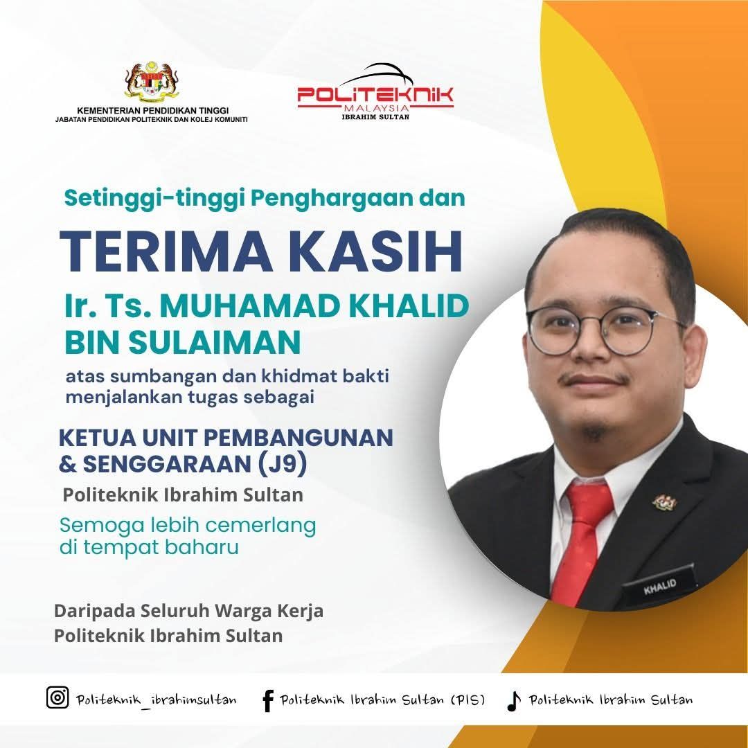 Setinggi – tinggi penghargaan dan terima kasih kepada Ir. Ts. Muhamad Khalid bin Sulaiman atas sumbangan dan jasa bakti sepanjang berkhidmat di PIS.