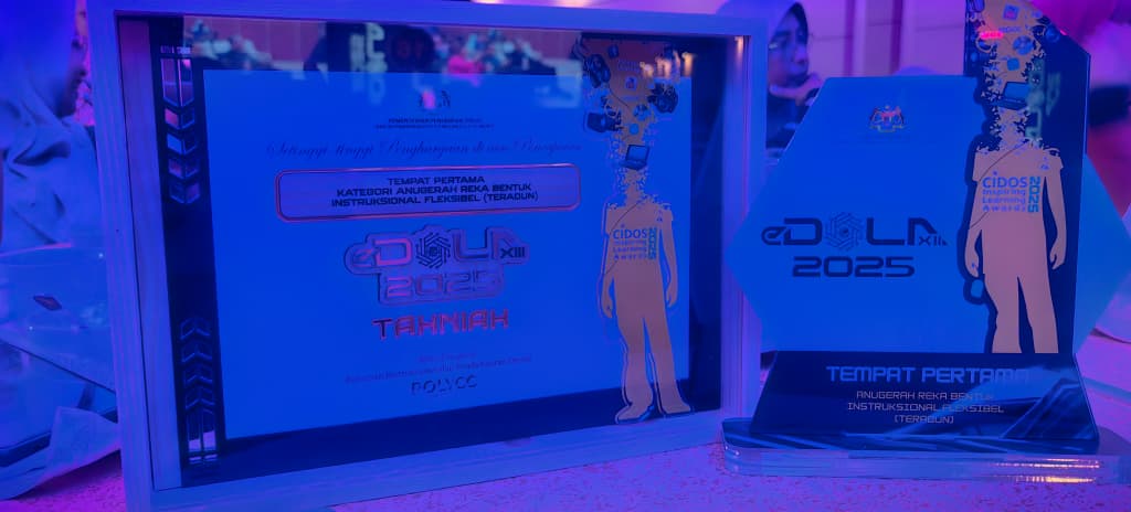 Sekalung tahniah dan penghargaan buat Puan Farhana Norazaman, Pensyarah Jabatan Kejuruteraan Elektrik, Politeknik Ibrahim Sultan atau kejayaan cemerlang merangkul tempat Pertama dalam anugerah Reka Bentuk Instruksional Fleksibel (Imersif Teradun) dengan membawa pulang Plak Anugerah, Sijil Anugerah Kecemerlangan dan wang tunai RM500.00.